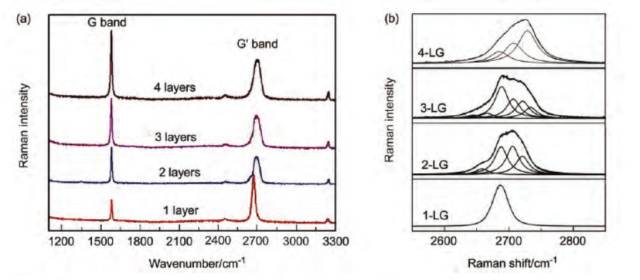 图2 (a)1,2,3,4层石墨烯的拉曼光谱;(b)1~4层石墨烯的拉曼G’峰 [1,2]