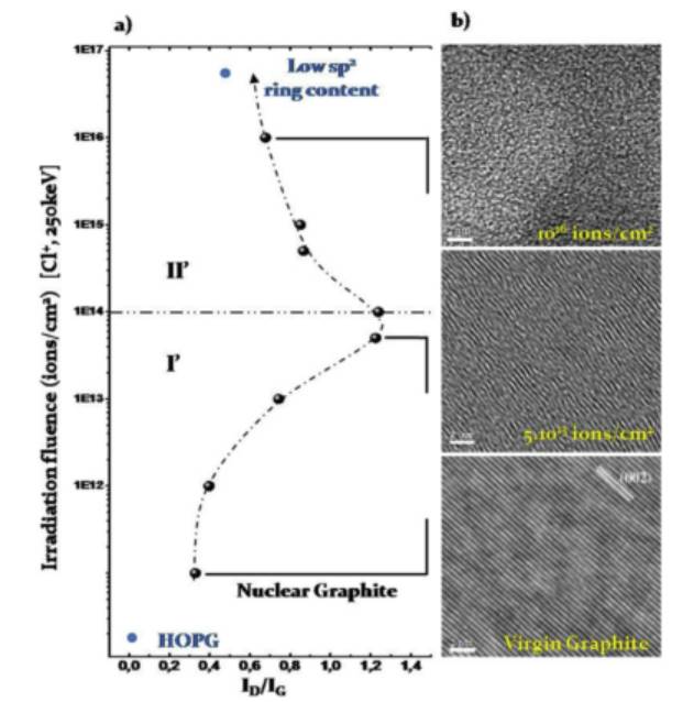图4 ID/IG随着37Cl+辐照能量增加的变化曲线图及对应的辐照能量的HRTEM图[4]