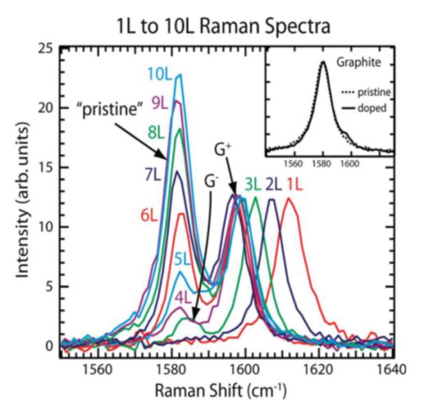 举例说明,图3[3]揭示了1~10层石墨烯的拉曼光谱(1550cm-1-1640cm-1),右上角插入的图为石墨烯材料在60 Torr的NO2下热暴露前后的拉曼光谱图。由图可知,对于单层石墨烯和双层石墨烯,G峰分别位于1614 cm-1和1608 cm-1附近。而三层石墨烯的G峰被劈裂成两个峰,分别位于1601.5 cm-1和1584 cm-1附近,后者标记为G-(低强度峰)。随着石墨烯层数超过3层时,G峰出现在1582 cm-1和1598 cm-1处,低强度峰的峰强也随着层数的增加而增加。由此可以确认NO2在石墨烯最表层和最里层的吸附效果。